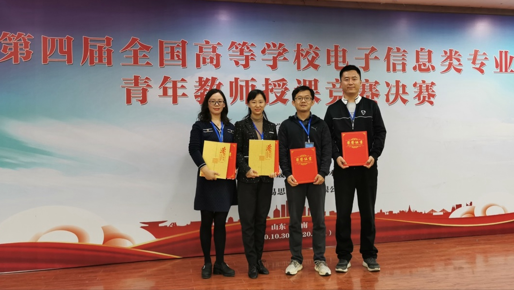 10月31日至11月1日,由教育部学校规划建设发展中心指导、中国电子学会主办、齐鲁工业大学(山东省科学院)承办的第四届全国高等学校电子信息类专业青年教师授课竞赛决赛在济南举行。我校信息工程学院4名青年教师参加比赛并取得了优异成绩,其中,李宁、岳雪亭老师获得华东赛区一等奖、全国总决赛三等奖,张亚峰、王瑞尧老师获得华东赛区三等奖。