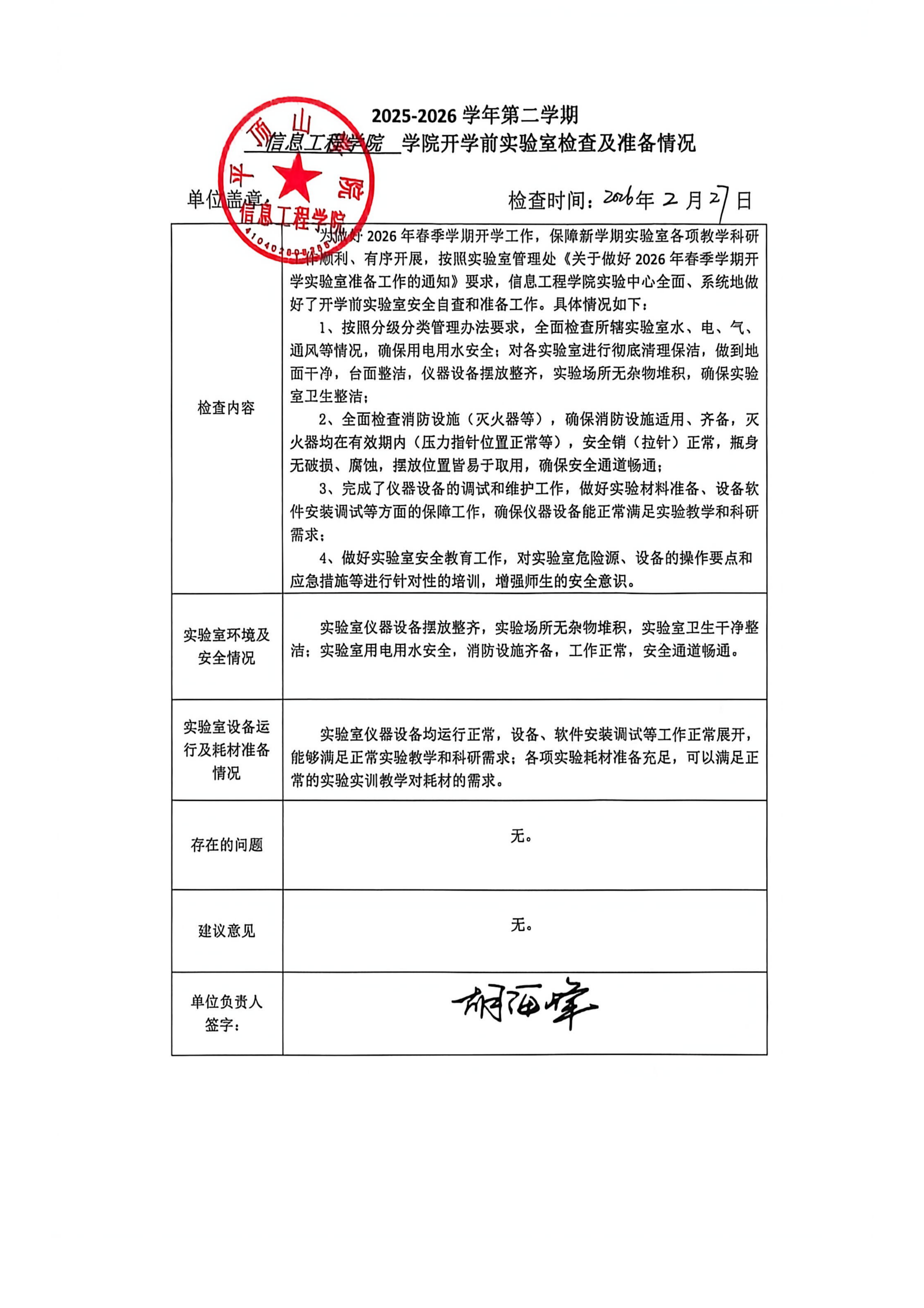 为做好2026年春季学期开学工作,保障新学期实验室各项教学科研工作顺利、有序开展,按照实验室管理处《关于做好2026年春季学期开学实验室准备工作的通知》要求,信息工程学院实验中心全面、系统地做好了开学前实验室安全自查和准备工作。具体情况如下: